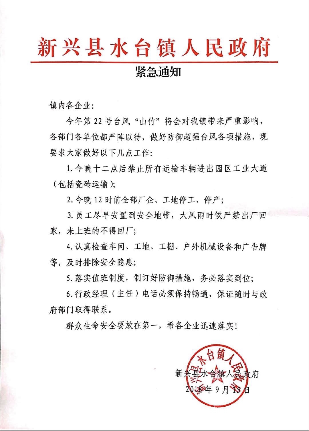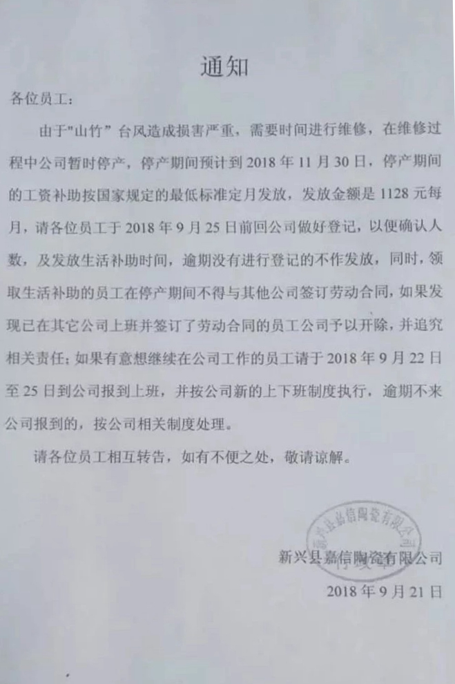 答:9月15日,“台风山竹”登录广东,云浮市新兴县水台镇政府马上召开紧急会议,为率先保证人员安全,实施“五停”紧急措施。嘉信陶瓷厂也在政府的要求下紧急停窑(有文件作证)。然而台风过后,威力之巨大对嘉信陶瓷厂的生产设备、厂房、货物造成了重创。直接影响到工厂的正常生产和员工的日常工作。因设备与厂房需要修复,目前只能停窑待工,预计在11月30日会陆续开窑。工厂的抛光线仍正常运作。