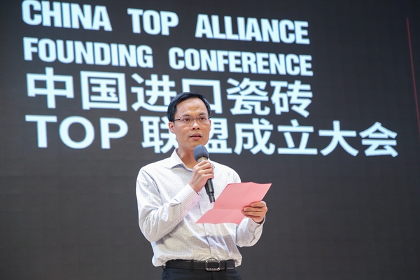 RAGNO中国区市场部总监陈柳莲担任成立大会主持人。会上,禅城区经济和科技促进局副局长黎国森致辞时对中国进口瓷砖TOP联盟的正式成立表示热烈的祝贺。随后他指出,进口这些原产自意大利及西班牙品牌的瓷砖,一是以陶为媒,落实国家一带一路倡议,支持国际间正常的贸易往来,构建开放型经济新格局。二是点燃创意,推动陶瓷转型创新驱动,助力佛山打造世界级陶瓷产业创新中心。三是更好满足人民日益增长的美好生活需要,立足国内,面向世界,让广大人民群众用上世界高品质产品。借用习近平总书记的话,“2000多年前,我们的先辈们就是怀着友好交往的朴素愿望,开辟了古丝绸之路,开启了人类文明史上的大交流时代。而今天的我们是传承古丝绸之路精神,积极参与 ‘一带一路’的交流与合作,走出去,引进来,互相促进,共同进步。这是历史潮流的沿续,也是面向未来的正确抉择。