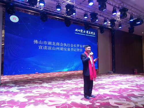 佛山市湖北商会执行会长罗东明宣读凉山州胡安泉书记贺信