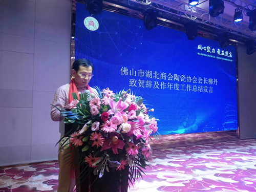 佛山市湖北商会陶瓷协会会长、中窑窑业董事长柳丹致贺词,感谢温暖凉山活动中大家为社会传递正能量的“大爱”与无私奉献,并作年度工作总结发言。