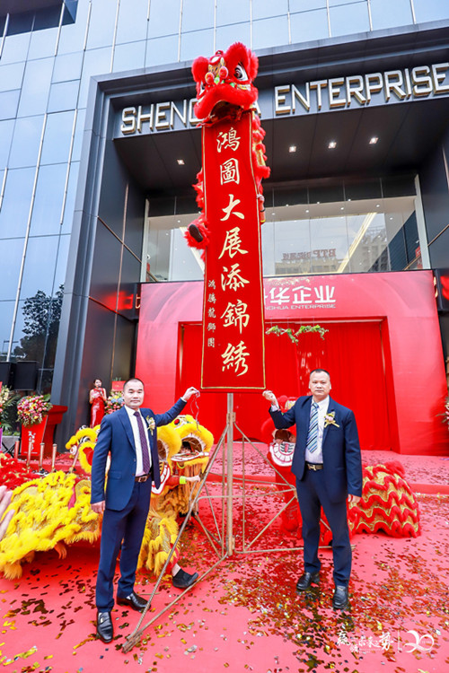 剪彩仪式把上午活动推上高潮,现场礼炮齐鸣,在喜庆、欢快的音乐声中,广东省陶瓷协会秘书长陈振广、升华企业董事长何标成、升华企业董事陈伟强、何坤、升华企业董事总经理张蜜敬、升华企业董事副总经理曾广清、升华企业财务部总监雷雪锋、升华陶瓷国内事业部总经理张飞、威廉顿国内事业部总经理吴建伟、升华陶瓷战略合作事业部总经理武文俊、升华企业广东事业部总经理彭丹,共同上台剪彩,揭开升华企业总部展厅新面貌。接着进行了醒狮点睛仪式,锣鼓阵阵送吉祥,瑞狮起舞好运至,更为现场增添了一份喜气。现场鼓声雷动,客聚如潮,热闹非凡。升华企业董事长何标成、董事总经理张蜜敬,上台为醒狮点睛、揭幕,共同开启新未来。