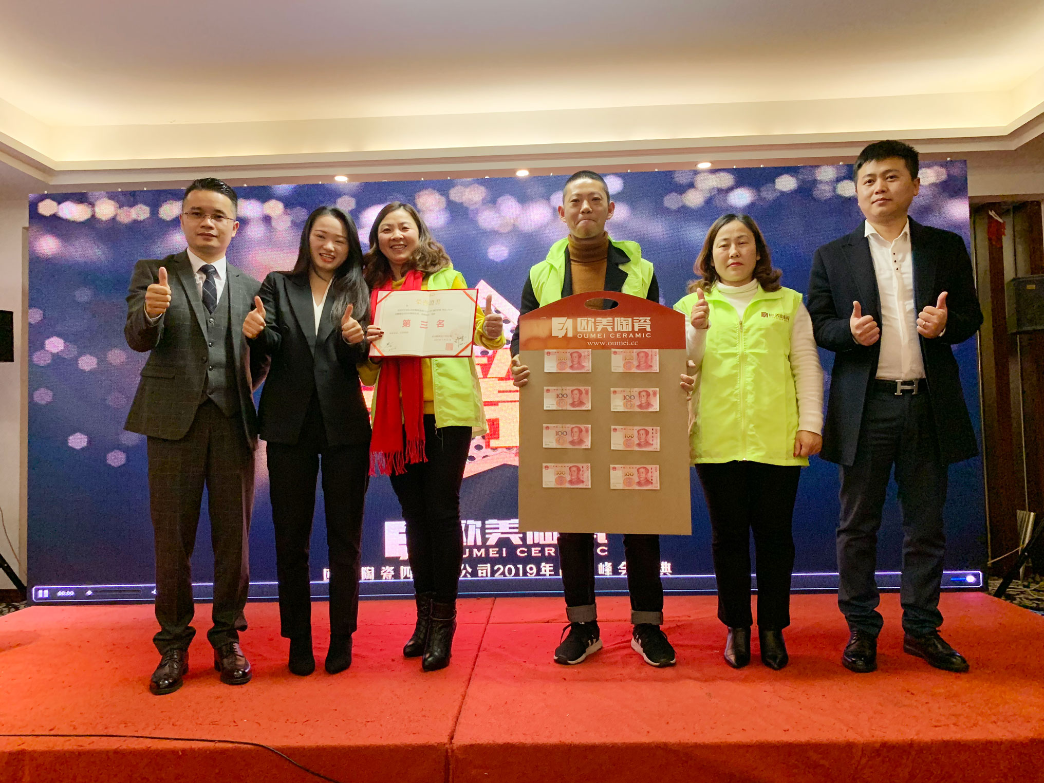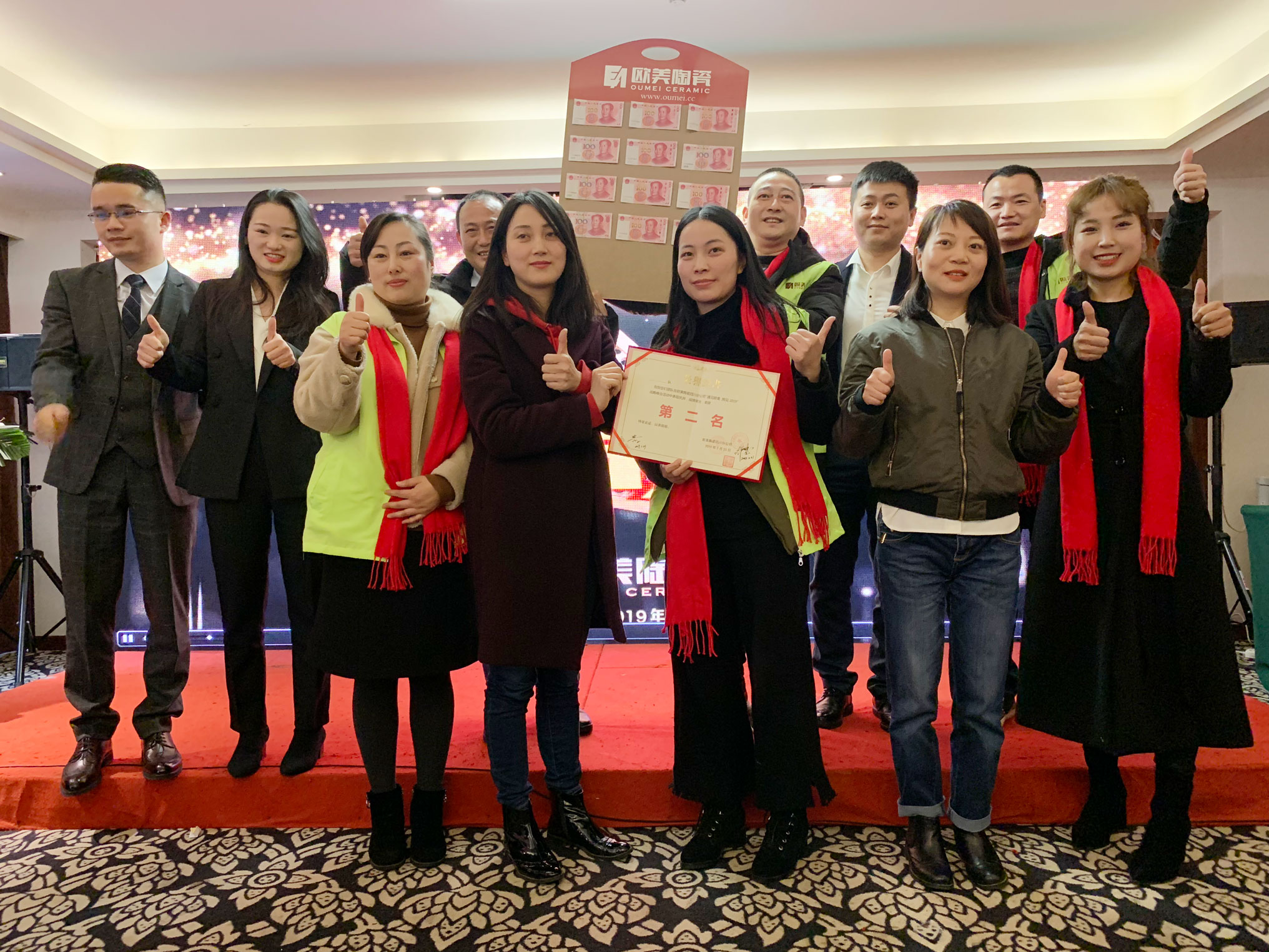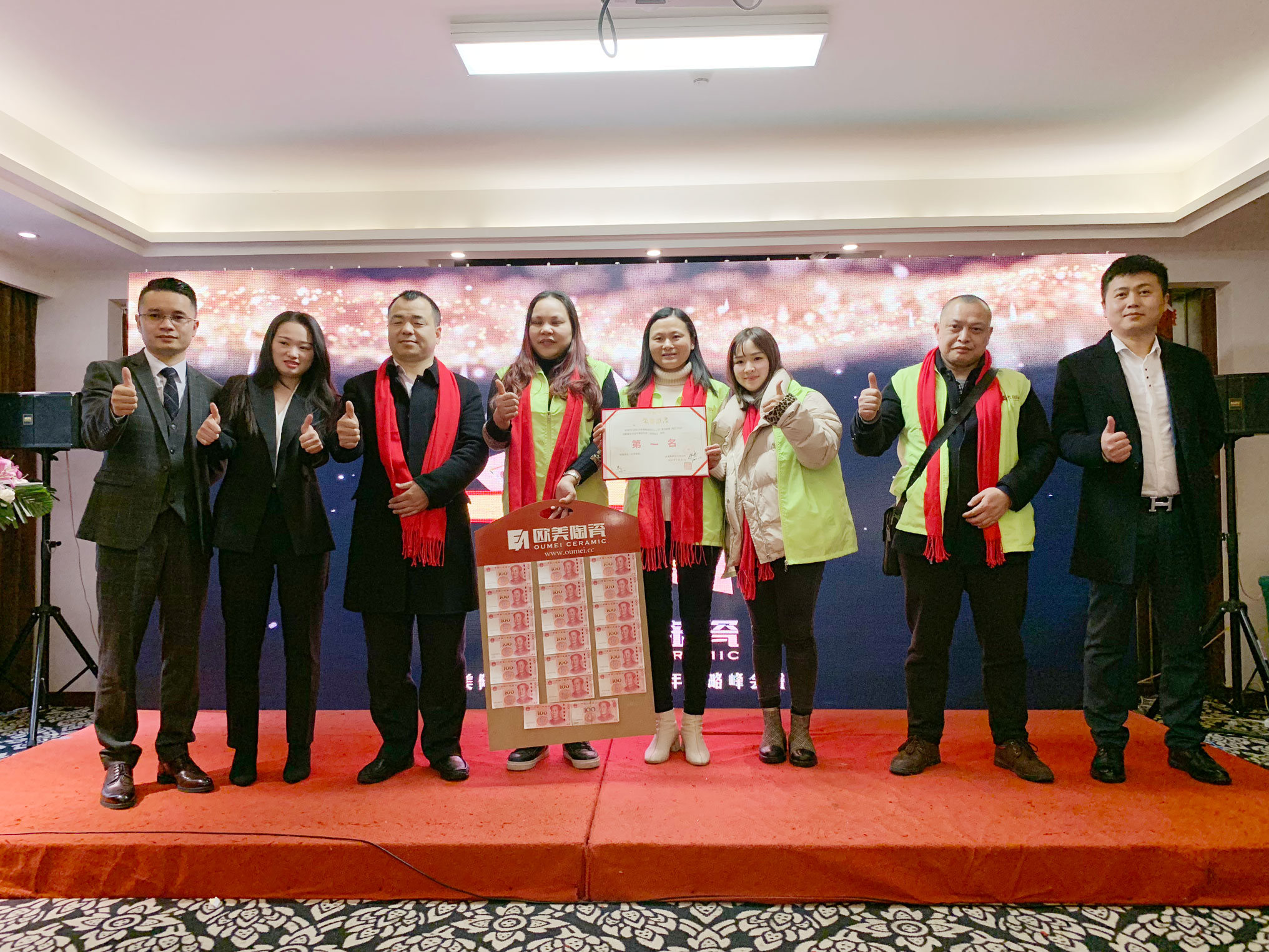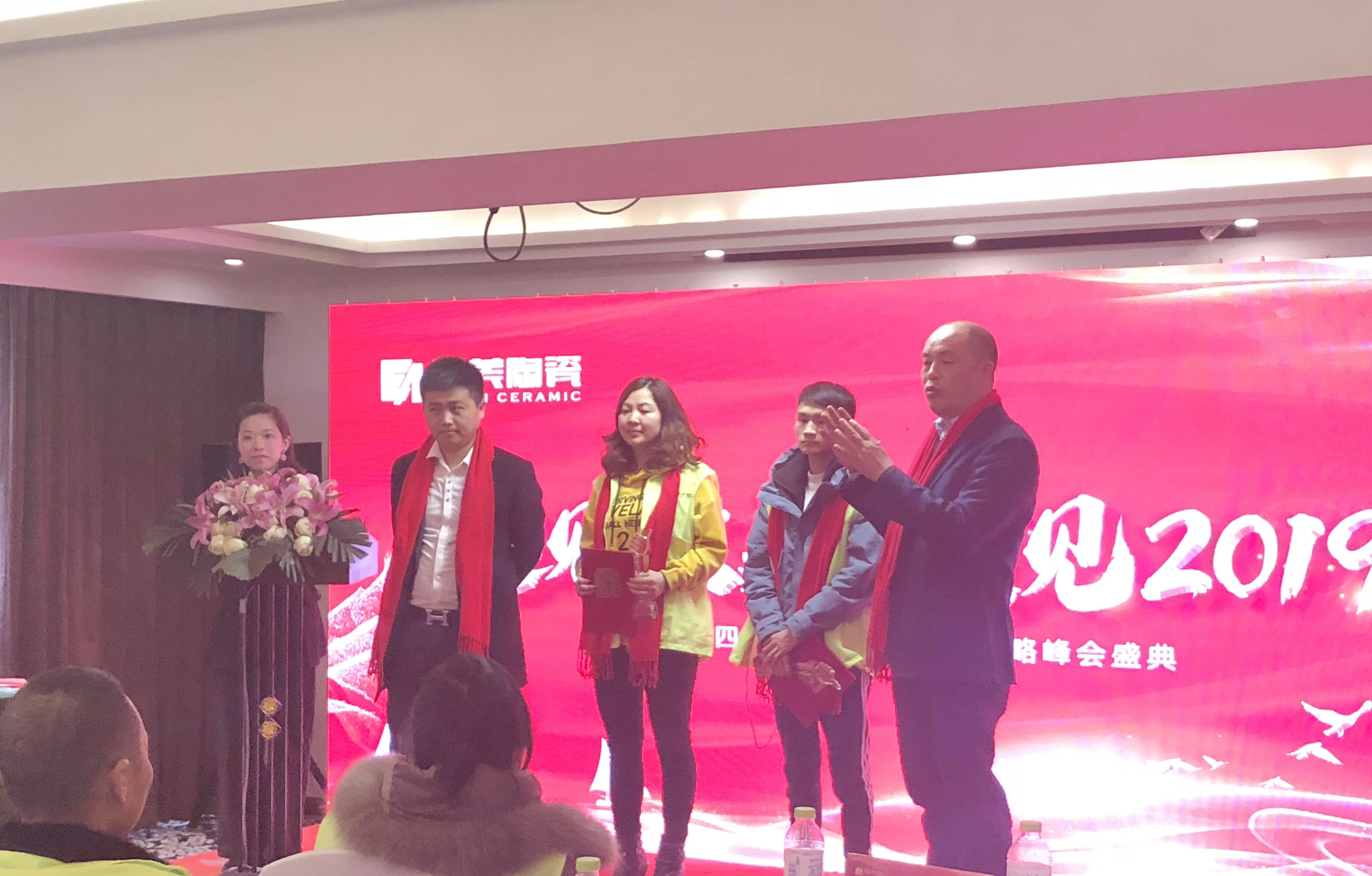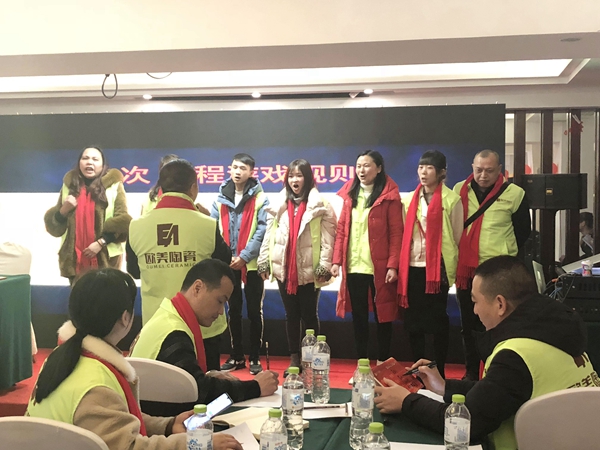 欧雅集团产品战略中心总经理陈培忠、形象建设中心总监林慧子、产品设计师、产品战略执行总监郭杰伟、欧美陶瓷四川分公司总经理郑显军、副总经理陆子民以及四川分公司全体员工和优秀经销商们一起共襄盛举,见证四川分公司2018年来的成就与喜悦,聚智共赢,携手开启2019新征程。