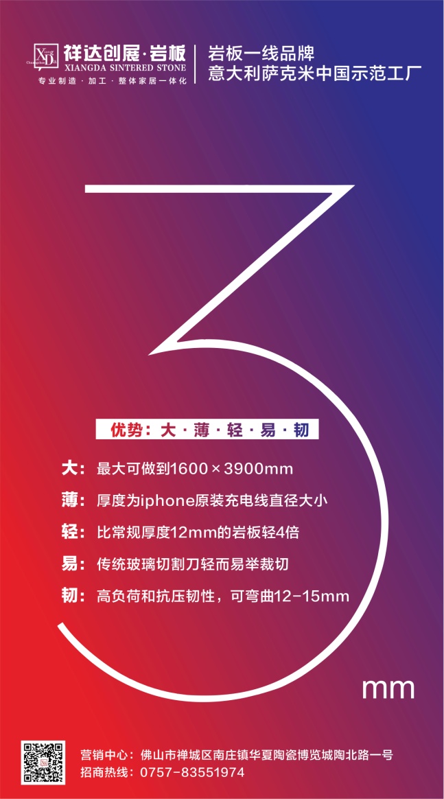 基于超薄岩板的多应用性,有优越物理性能的产品基因和多样的花色纹理做支撑,祥达创展3MM超薄超大岩板的量产,将成为打开全面“定制化”大门的金钥匙。