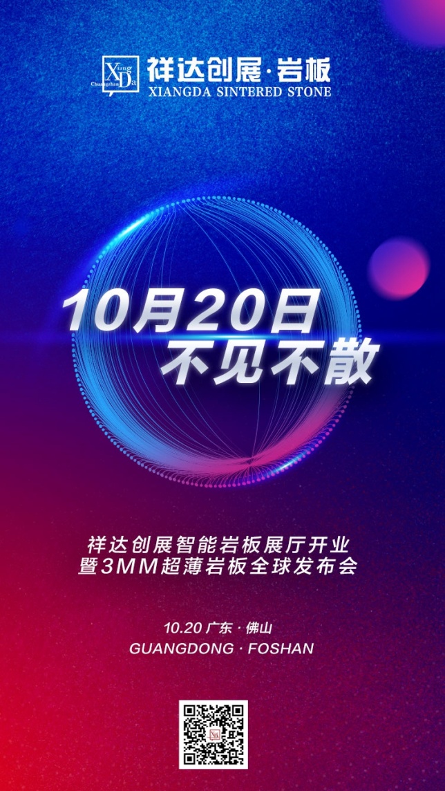 兹定于10月20日,为祥达集团智能岩板展厅开业暨3mm超薄岩板全球发布会,届时来自世界各地的合作伙伴将有机会一睹【3mm超薄超大岩板】新品的风采。岩板新蓝海,共创新未来,祥达集团诚挚邀请更多合作伙伴加盟,共创、共享、共赢!