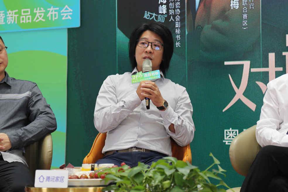 而作为资深媒体人,搜狐家居负责人许俊则从媒体人的角度分析了大板瓷砖和岩板的区别,并列举了目前行内对岩板和大板瓷砖的混淆现象,指出了本次「对话•真假岩板」的重要性。