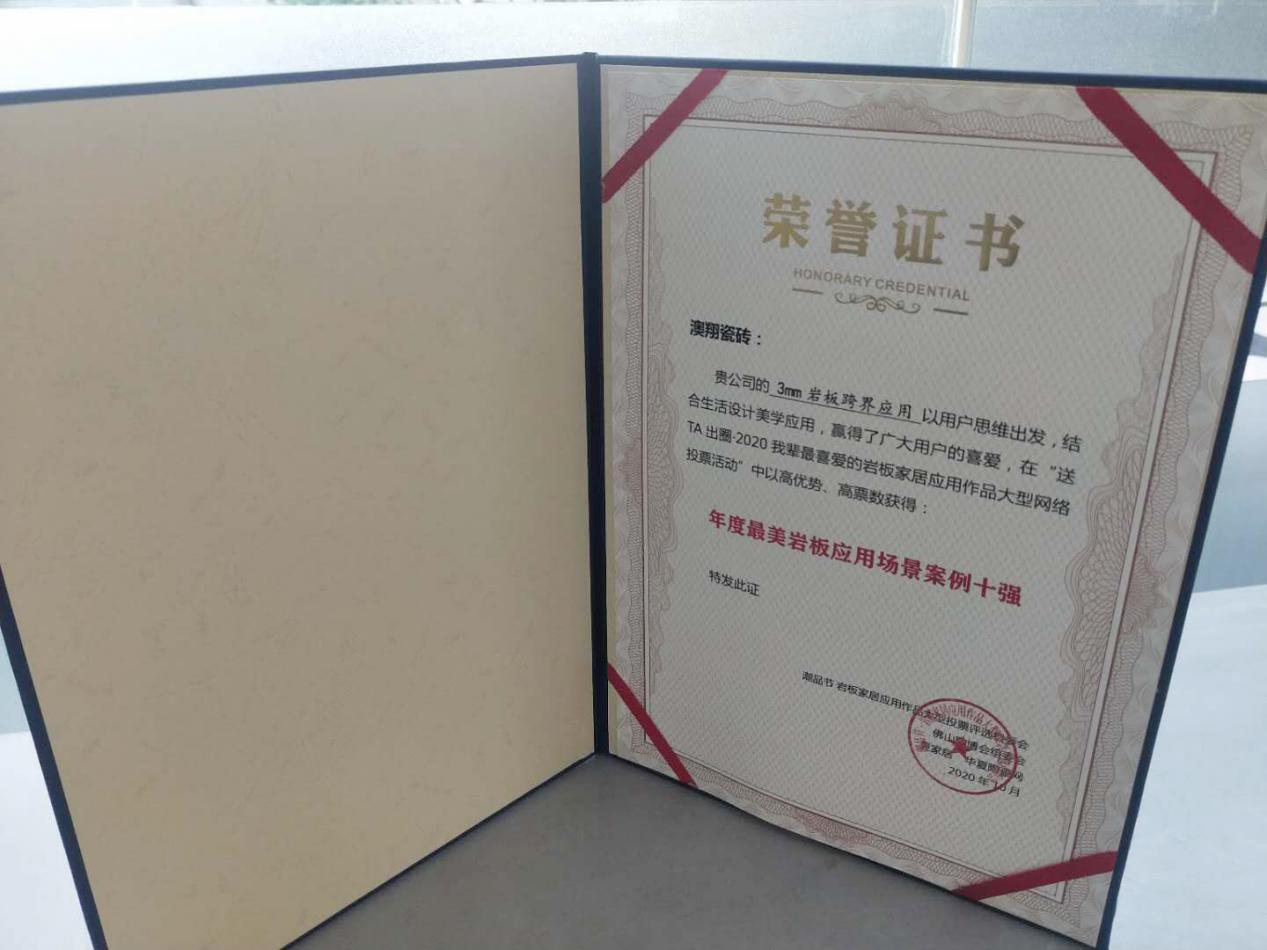 陶博会期间,澳翔岩板凭借3mm岩板跨界应用,荣获由2020首届潮品节组委会主办,更家居、华夏陶瓷网、佛山陶博会联合发起的“2020我辈最喜爱的岩板家居应用作品大型网络投票活动”-【最受用户喜爱的岩板家居产品十强】,澳翔岩板能够在众多品牌产品中脱颖而出,一举夺魁,除了是业界对我们产品实力的认可,更是市场用户对我们品牌理念的肯定。