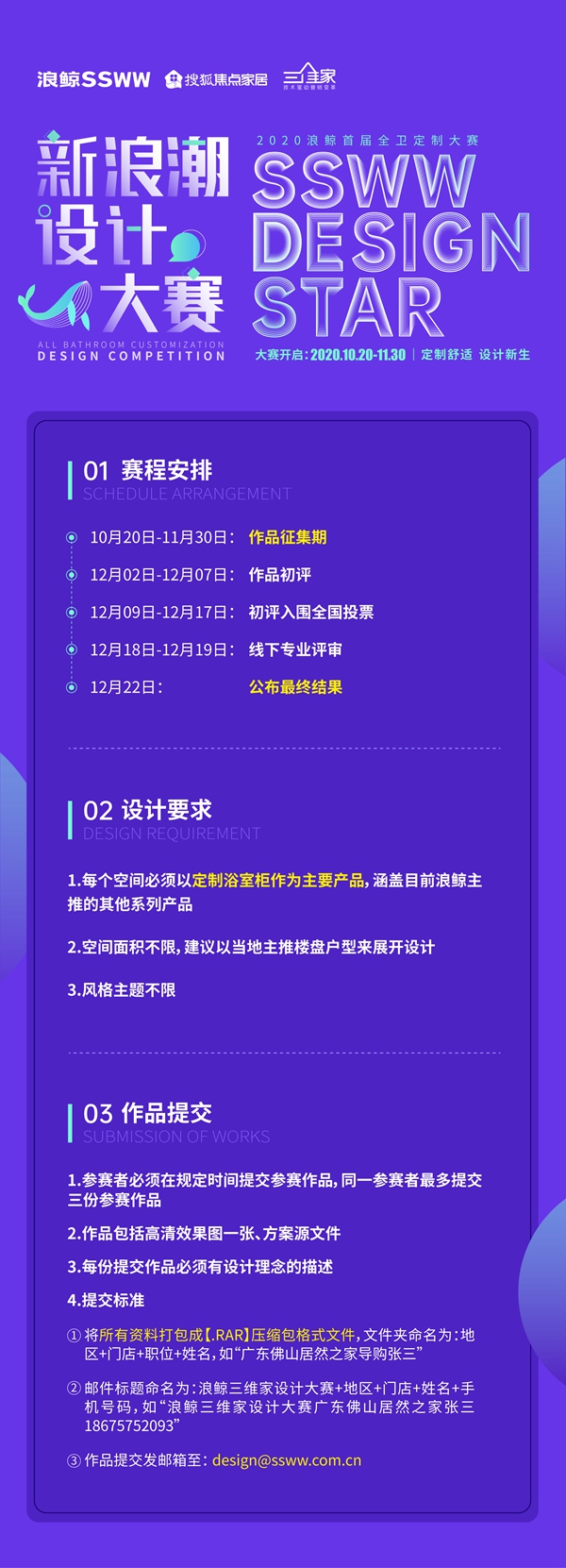 10月20日,由浪鲸卫浴、搜狐焦点家居、三维家联合举办“新浪潮“设计大赛——2020浪鲸卫浴首届全卫定制大赛正式开启!活动将联合行业大咖、媒体大咖、设计大咖组成专业评审团,并通过面向全国以投票形式为参赛作品进行评选。