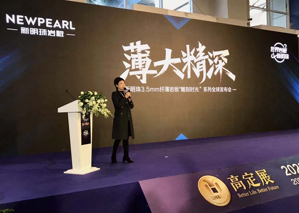 会后,广东电视台为新明珠集团董事长助理兼岩板事业部总经理梁风华进行了专访。梁总表示新明珠岩板以打造“世界岩板第一品牌”为目标,集团坚持产品创新和开发,具有强大的生产设备。这次的“雕刻时光”新品,可在3.5mm纤薄岩板上做出精致的“雕刻”效果,开创了纤薄岩板质感精细化的先河。