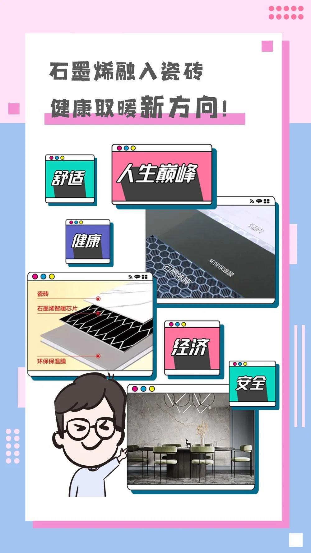 出圈的创新营销,离不开出色的硬核产品,据了解,冠珠、萨米特瓷砖在新型饰材的研发上一直领跑同行,石墨烯智控发热瓷砖作为代表作之一,目前深得广大家庭、房企的青睐。该产品由石墨烯智暖芯片、环保保温板三部分组成,充分发挥石墨烯优异的导热性能,能实现99%电热转化率,较传统采暖方式节能35%以上。