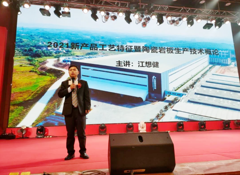 新品发布是每次年会的一大亮点,会上,广东冠星陶瓷企业技术总监江想健现场为大家讲述2021年新品设计亮点,并围绕产品特点、销售卖点、工艺应用、技术突破等角度展开深入解读,并针对先进的岩板技术进行一系列干货分享,赋能经销商提升战斗力,持续赢战终端。