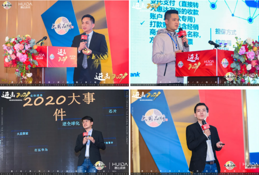 与此同时,惠达瓷砖产品部总监甘锡坤、微众银行范示鸿、酷家乐商学院院长郑炳晨、高标营销咨询事业合伙人罗波,分别就惠达瓷砖2021年产品规划,惠达经销商融资方案、智慧门店及终端设计赋能、3.15活动执行,进行了主题演讲。