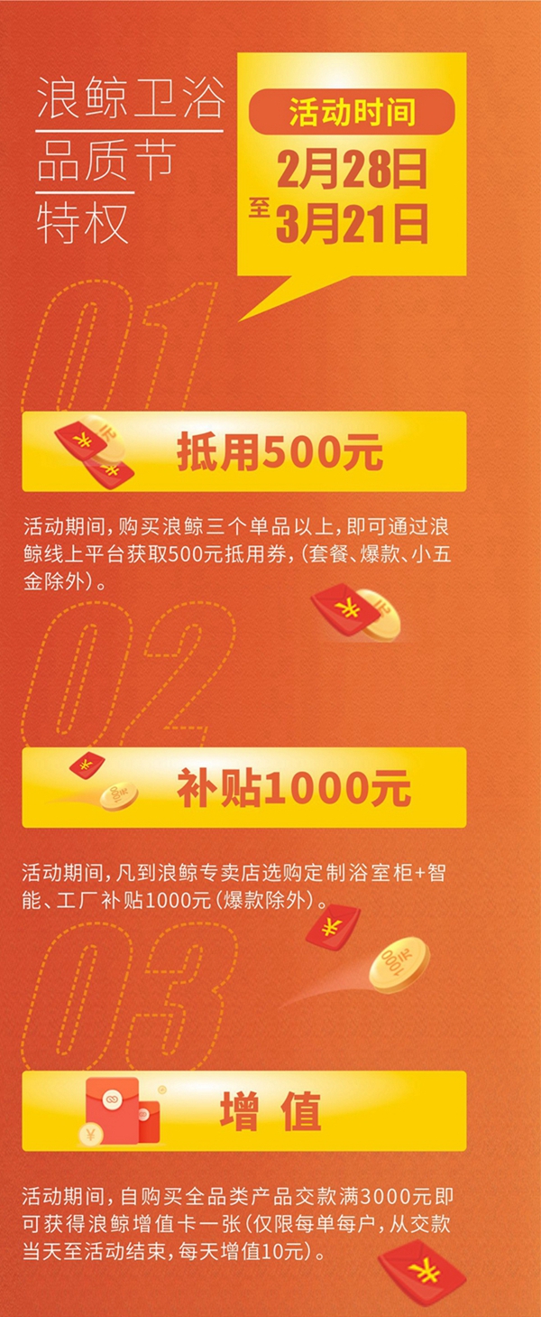 此次315品质节,以迎合当下80后、90后群体对于品质、健康生活日益增长的需求,让消费者既能够享受活动的优惠同时,更能给自己及家人送去一份健康、一份放心。浪鲸卫浴将通过“500元抵用券、工厂补贴1000元、增值卡”等一系列优惠特权为消费者打造购物狂欢的乐趣。