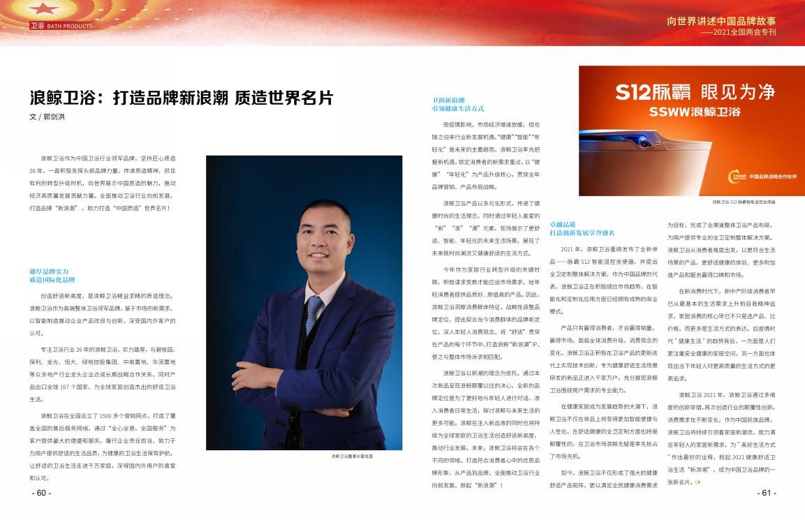 为进一步深入总结我国品牌强国发展进程中探索出的新思想、新经验、新模式,挖掘深度报道,讲好中国品牌故事,展示好中国品牌形象,提升中国品牌在国内外的知名度和美誉度,中国品牌杂志社、中国品牌网特别策划推出“2021年全国两会《向世界讲述中国品牌故事》”为主题的综合深度专刊报道。始终坚持“同一个世界 同一个浪鲸”的品牌使命的浪鲸卫浴, 以其强大的品牌影响力和和技术创新力再次入选中国品牌2021全国两会专刊,向世界展示中国品牌。