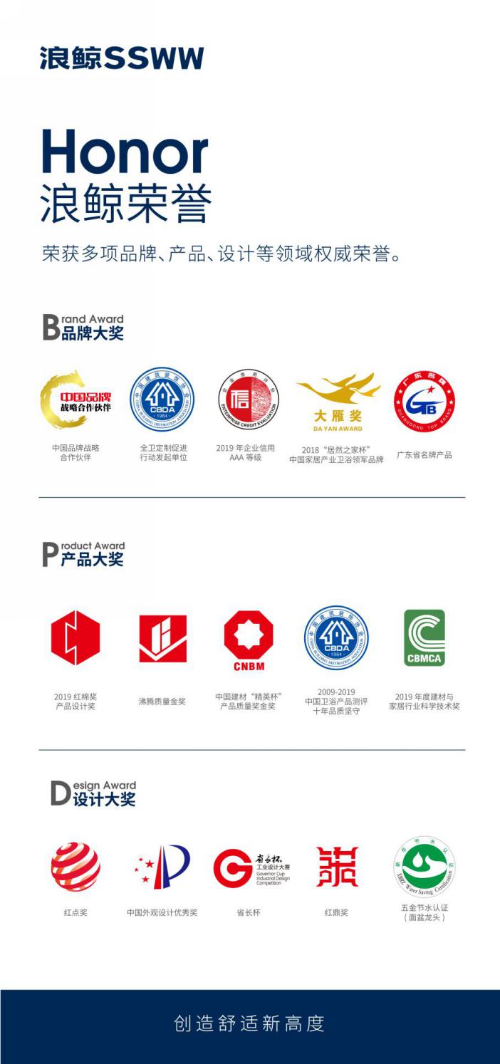 浪鲸卫浴,品质领跑。拥有行业领先的全自动隧道窑生产线,并建立综合的产品检测中心,形成专业统一的综合监管体系,确保高质出品。多年来,浪鲸卫浴更是始终坚持技术创造、设计创新,在产品上主动进行技术研发和突破,赋予产品更多人性化的关怀。正是基于拔尖的设计优势与产品实力,浪鲸卫浴频频夺金,前后荣膺了沸腾杯、省长杯、红棉奖、红点奖、匠心品牌、佛山市专利富豪企业等多项权威机构颁发的奖项。