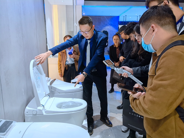 德国COSO高斯卫浴的项目经理欧阳效文带领下,媒体代表参观了高斯的产品展厅。COSO高斯卫浴涵盖了五金、智能马桶、浴室柜、淋浴房等产品,对产品的选材有非常严格的把控,铜材的选择严格遵循国内九五、六二等标准,保证产品可以使用一百年不变。产品的表面,则有11种不同的表面处理方式,可满足设计师和消费者的个性化需求。