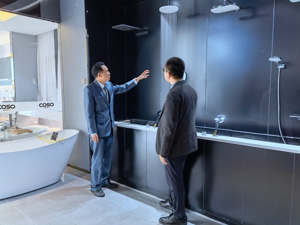 水龙头、花洒、洗手盆、浴室柜、淋浴房、马桶、水槽五金挂件等等,COSO高斯卫浴三楼展厅琳琅满目的卫浴产品让人目不暇接,其中优质的内在材料和人性化的产品设计仿佛为大家打开了一扇新世界的大门。仅是水龙头一项,就有可伸缩、可摇摆、可调温等等品种,令人啧啧称奇。水龙头的安装也有特别的设计,快捷方便永不松动。