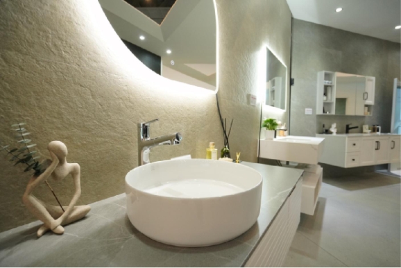 宝达集团萨兰特岩板性能优越,颜值出彩,稳步推进室内外一体化应用的深化,可以铺地也可以上墙,还能成为各式家具——做上浴室柜、茶几、餐桌等的创意定制。您被GET到了么......