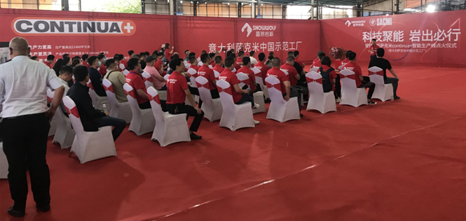 4月17日,雪狼岩板在肇庆市高要区生产基地举行了萨克米continua+智能生产线盛大点火仪式。集团董事长蔡丰安、集团董事蔡兰华、生产总监黄国火、厂长甘振宇、市场总监蔡耶特、岩板销售总经理林志军、雪狼岩板瓷砖品牌总经理童恩俊、市场部总监邓枝茂等企业领导与媒体齐聚仪式现场,共同见证科技与实力并驱的重要时刻。