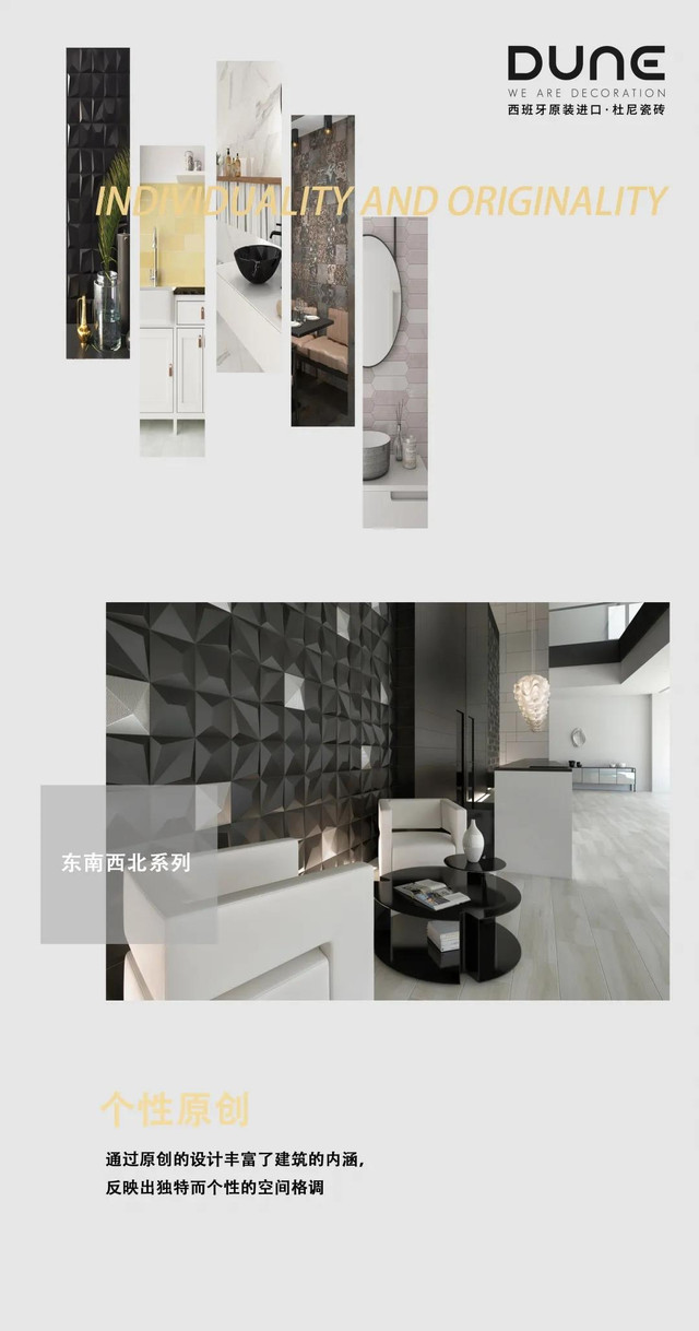 作为潮流趋势的设计者,DUNE瓷砖一直着力原创,以趋势带动行业,用设计带动潮流,探索瓷砖行业更多的表现形式与潜在可能,为消费者带来同步世界的生活方式。
