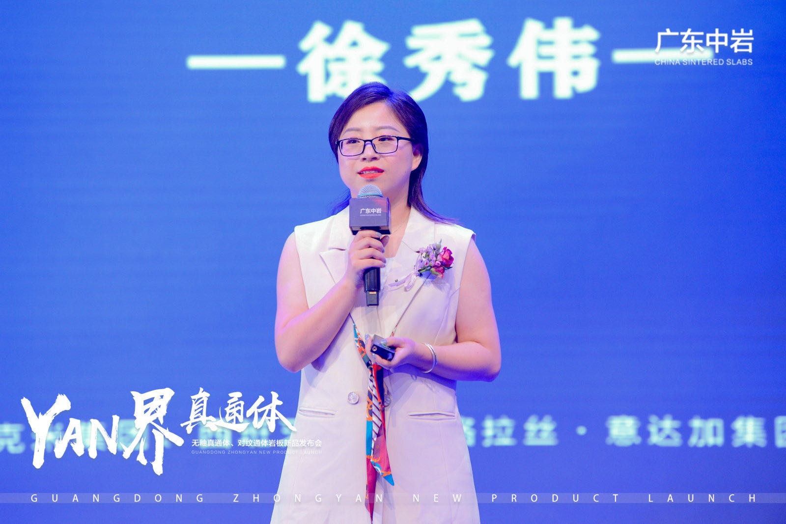集团市场战略部总经理徐秀伟表示,中岩成立至今已有580天,这580天的时间,中岩从设备引进、产品研发、上线生产、市场占领、品牌推广、乃至产品售后等每一个环节,都以弯道超车的高增长模式,给每一位中岩人带来惊喜和信心。会议中她问:为什么选择中岩?因为中岩:有60后的董事长,高瞻远瞩、掌舵有方,投资/战略布局稳扎稳打;有80后的生产总裁,生产体系的中流砥柱,生产保质保量;有90后的营销总裁,行业洞察的主力军,创新大胆,打造岩板新营销时代。发言中,她详细分享本次新品的优势与特性,让在座宾客如获至珍。