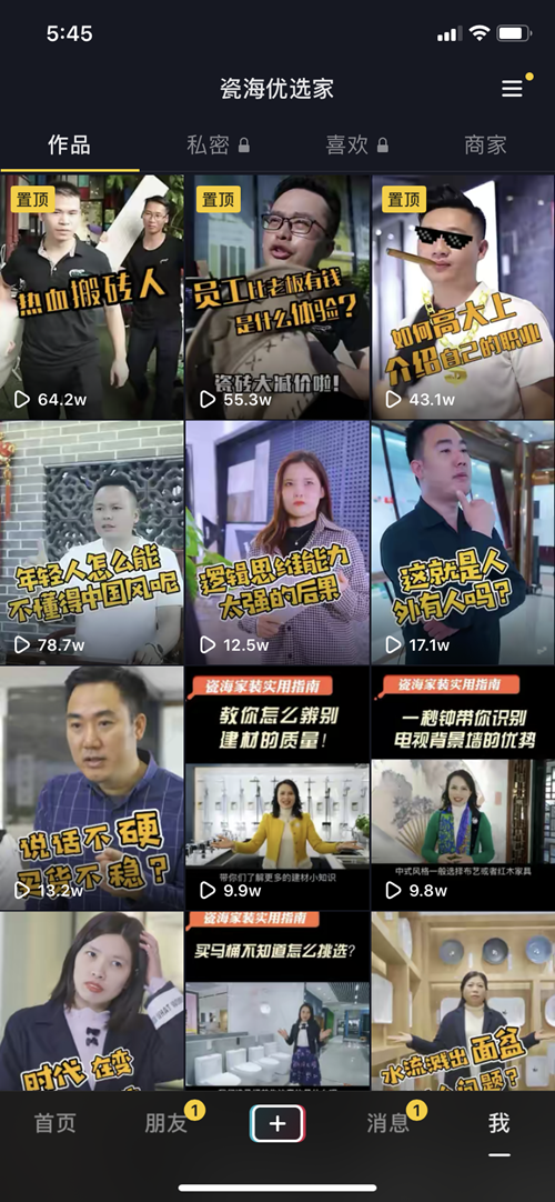 通过几个月的“摸爬滚打”摸索一条赋能引流的道路,朝着C端、设计师方向发展,一条又一条短视频累积,成为佛山建陶行业数一数二的抖音号!