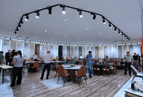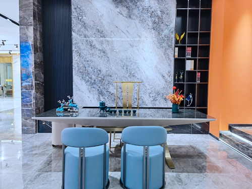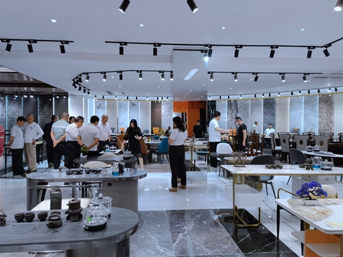 板匠丽居公司展厅选址中国陶都佛山市禅城区南庄镇华夏陶瓷城黄金地段,展厅规模1200平方米,展示岩板餐桌,餐台,岩板茶几,电视柜,岩板橱柜及岩板岛台等,并于2022年5 月份全面投入运营。