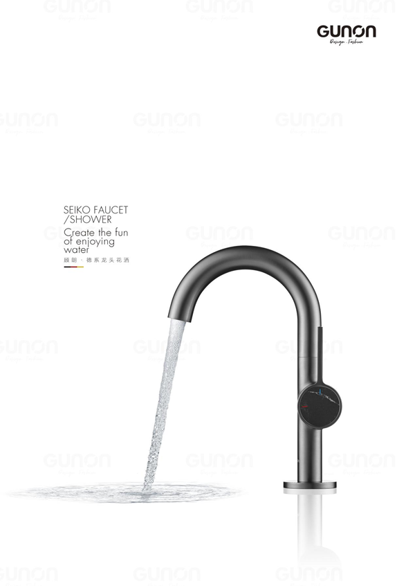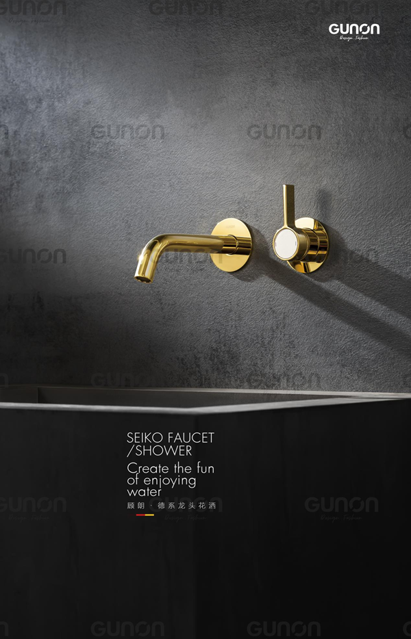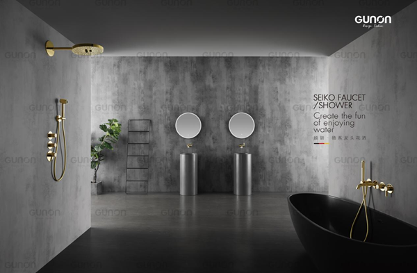 该系列主打奢华金、拉丝镍、枪灰色三大色系,其陶瓷岩板质感元素和金属质感元素相碰撞,将顾朗卫浴一贯坚持的极简之美发挥得淋漓尽致,尤其是在用水的舒适感体验的方面,给与会嘉宾留下耳目一新的印象。