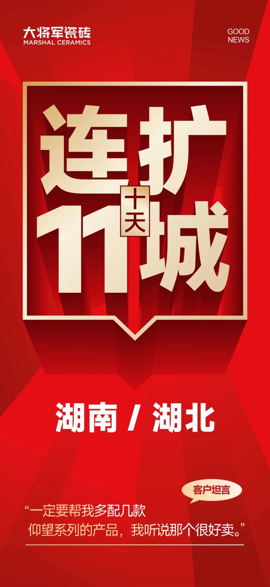 在瓷砖行业厮杀激烈的战场上,品牌突围犹如逆水行舟。大将军瓷砖却硬是在5月12日至22日这短短10天里,从湖南湖北市场撕开突破口,一口气签下11家新店。这记漂亮的"闪电战",背后藏着22年老牌企业的三大实战秘诀。