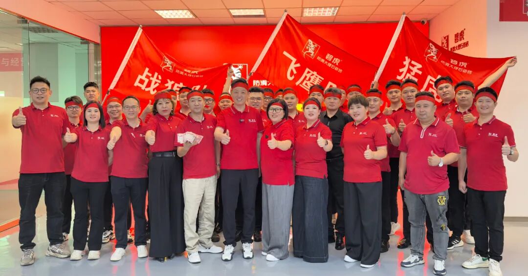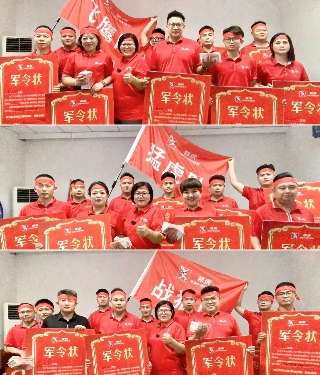 随后,全体销售精英郑重签下军令状,接过战旗,收获总部 “早成交” 的满满福气。众人高举战旗庄严宣誓:“明确目标,势必达成,全力以赴,争做冠军”!