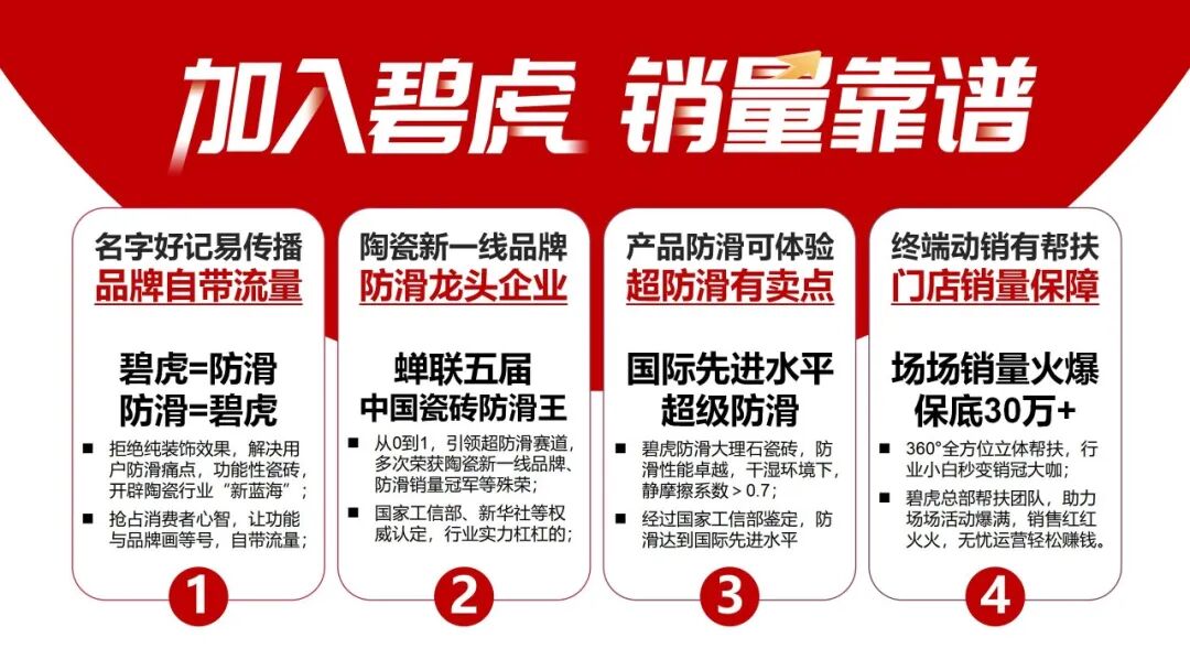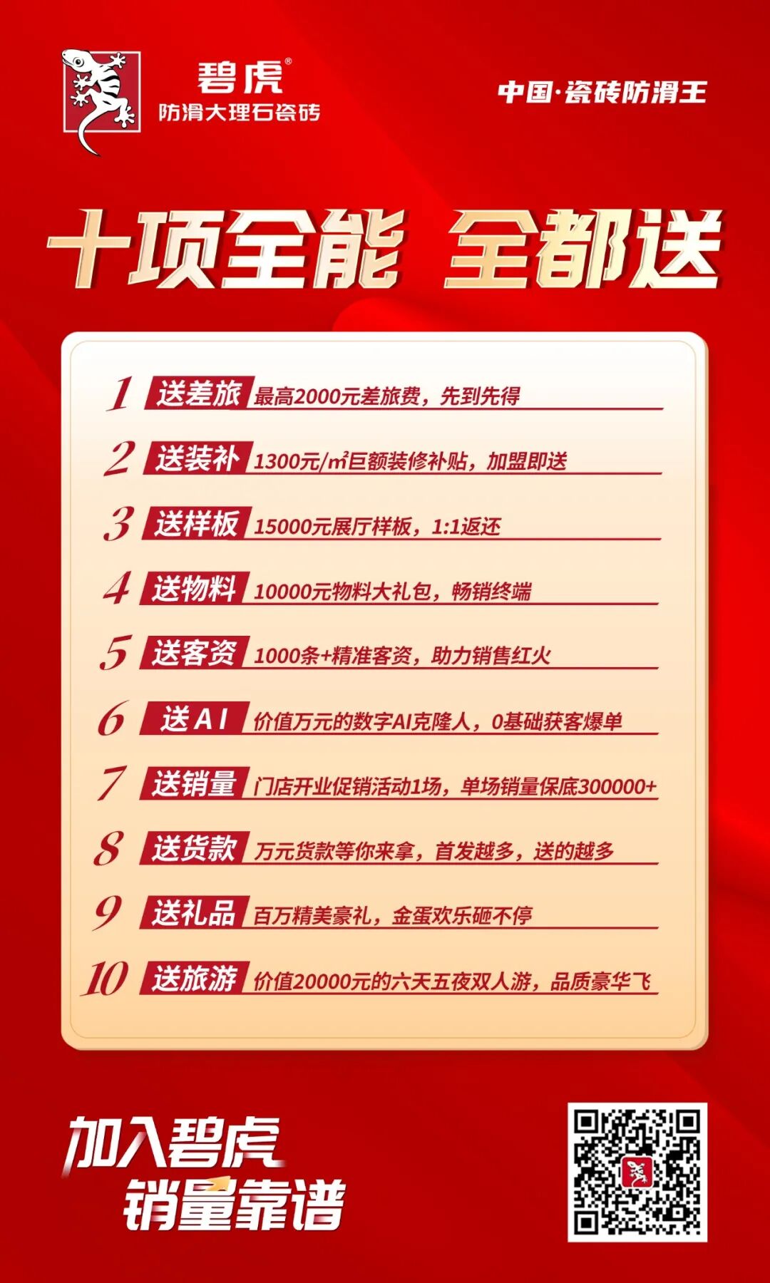 作为蝉联五届中国【瓷砖防滑王】,碧虎始终践行“招商、育商、扶商” 的合作理念。此次秋季选商会,总部推出专属加盟政策,全国仅开放30个黄金席位,尊享 “送差旅、送装补、送样板、送物料、送客资、送AI、送销量、送货款、送礼品、送旅游” 等10大特权!更有价值百万的开业大礼包,等你来抢!