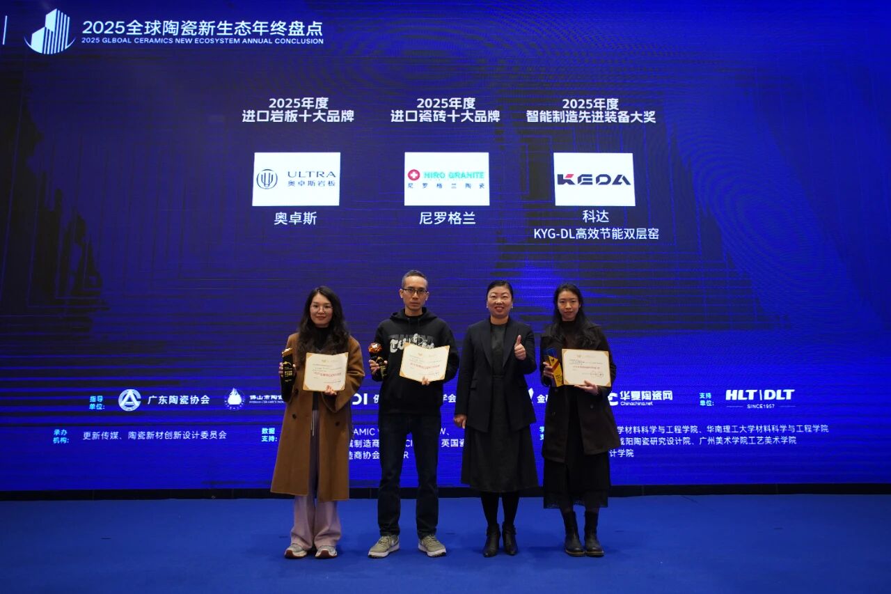 “2025年度进口岩板十大品牌”,有奥卓斯岩板、尼罗格兰陶瓷等品牌;“2025年度智能制造先进装备大奖”,有科达制造(KYG-DL高效节能双层窑)。