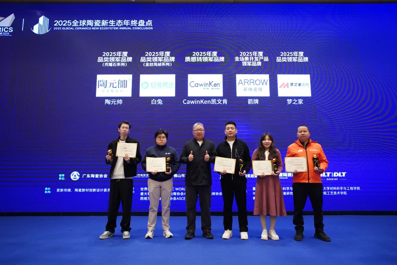此外,“2025年度品类领军品牌”,包括有陶元帅瓷砖(克隆石系列)、白兔瓷砖(金丝兔绒系列);“2025年度质感砖领军品牌”,则有CawinKen凯文肯素色质感砖;“2025年度全场景开发产品领军品牌”,有箭牌瓷砖;“2025年度品类领军品牌”,有梦之家瓷砖。