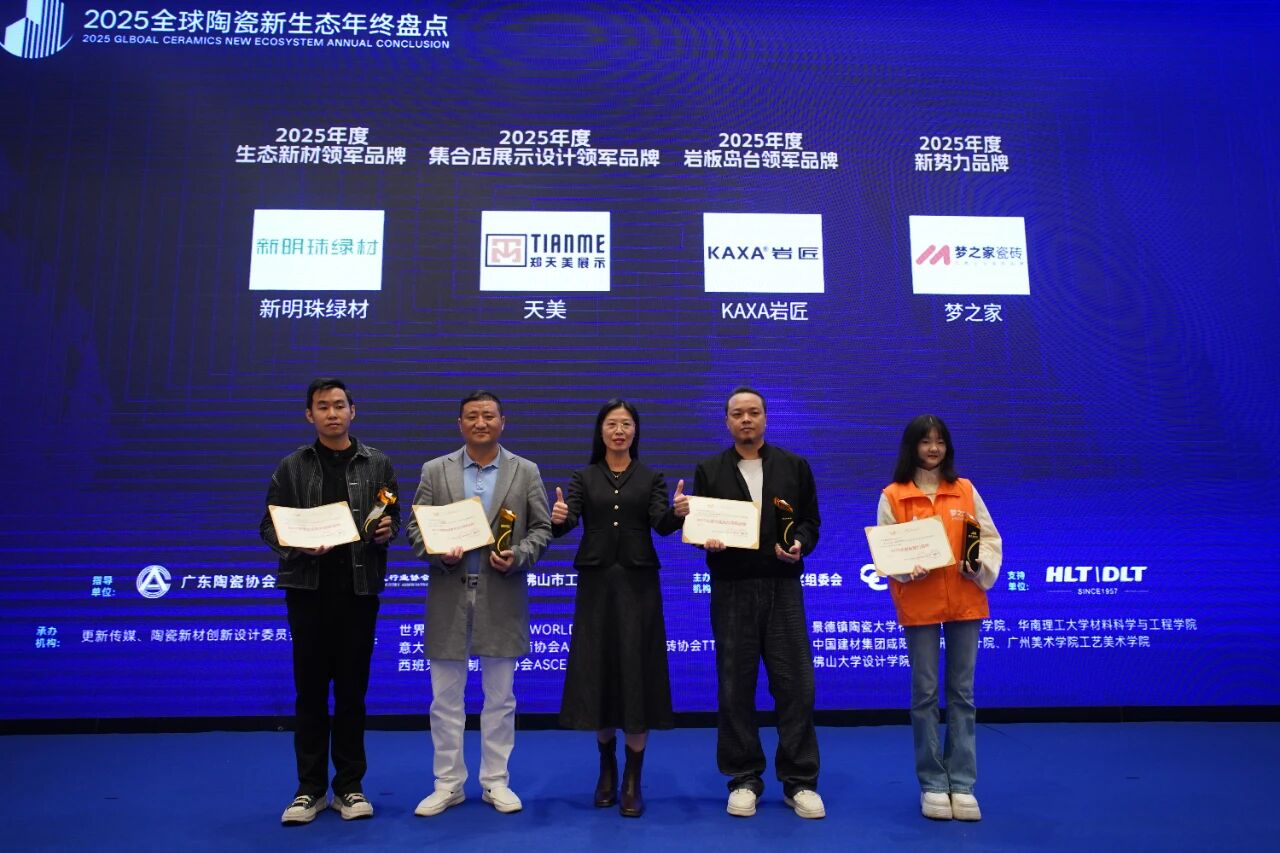 “2025年度生态新材领军品牌”,有新明珠绿材;“2025年度集合店展示设计领军品牌”,有天美展示;“2025年度岩板岛台领军品牌”,有KAXA岩匠;“2025年度新势力品牌”,则有梦之家瓷砖。