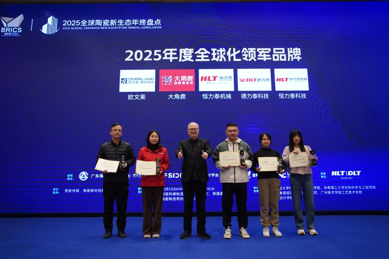 “2025 年度全球化领军品牌”,包括有:欧文莱素色瓷砖、大角鹿超耐磨瓷砖、恒力泰机械、德力泰科技、恒力泰科技。