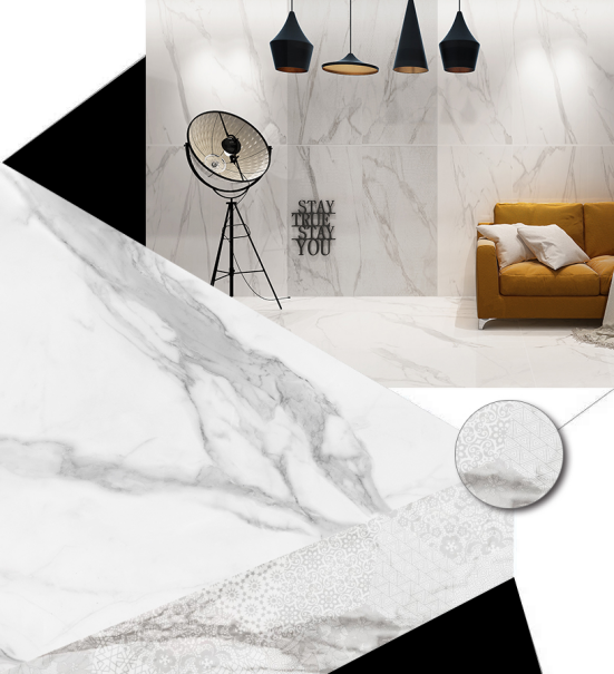 天然大理石纹路千变万化,完全标准化仿造的大理石瓷砖不能触及天然石材的灵魂所在,而“巨石代”新品,精选世界珍稀经典石材纹理,如卡拉拉、鱼肚白等,且以全球领先的数码喷墨技术,呈现纹理逼真、自然丰富的效果,使产品表里如一,装饰效果