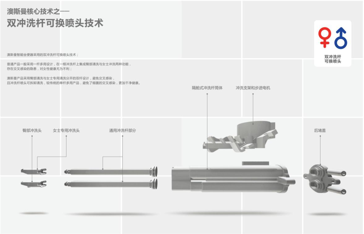 澳斯曼ASK025Z将妇洗和臀洗分开来,专杆专用,避免了臀妇洗交叉使用时水珠飞溅污染冲洗孔,双杆冲洗,更加科学,更加卫生,更加健康。