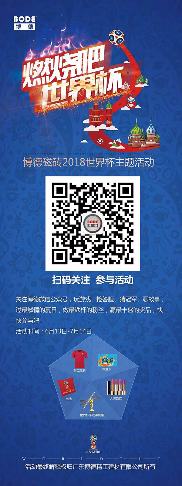 6月13日-7月14日,“玩转世界杯 享年中钜惠”主题促销活动将在全国各大终端门店展开,1元抵扣千元,不仅实惠到家,还有正品足球球衣等您拿!(活动政策详询博德国内各大终端门店)