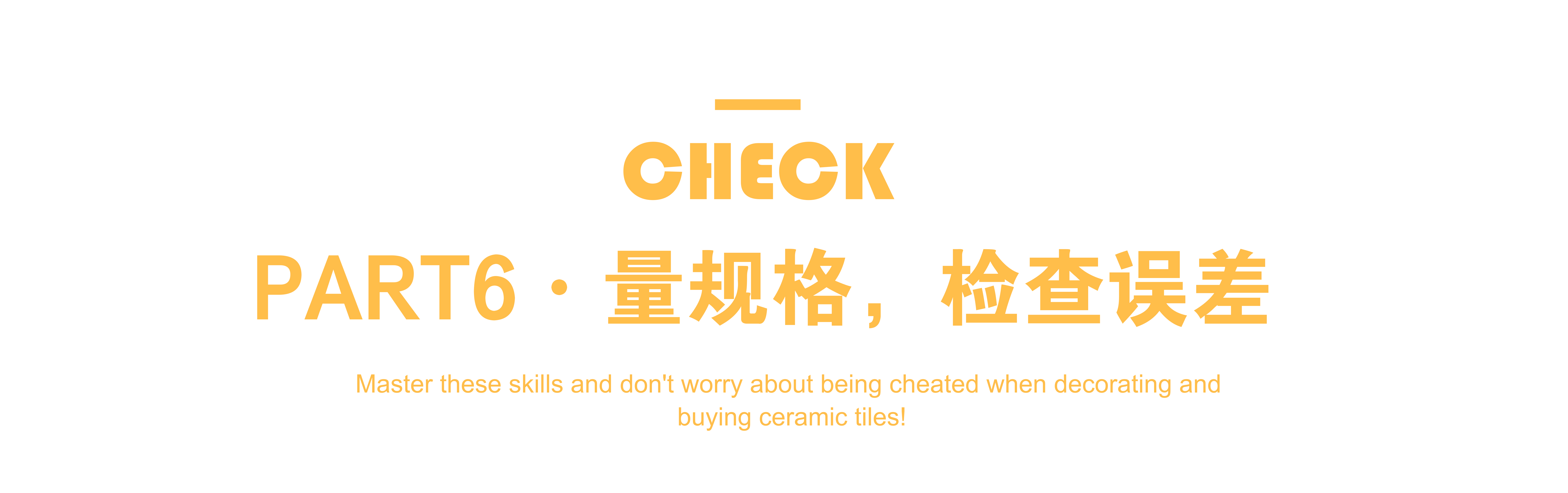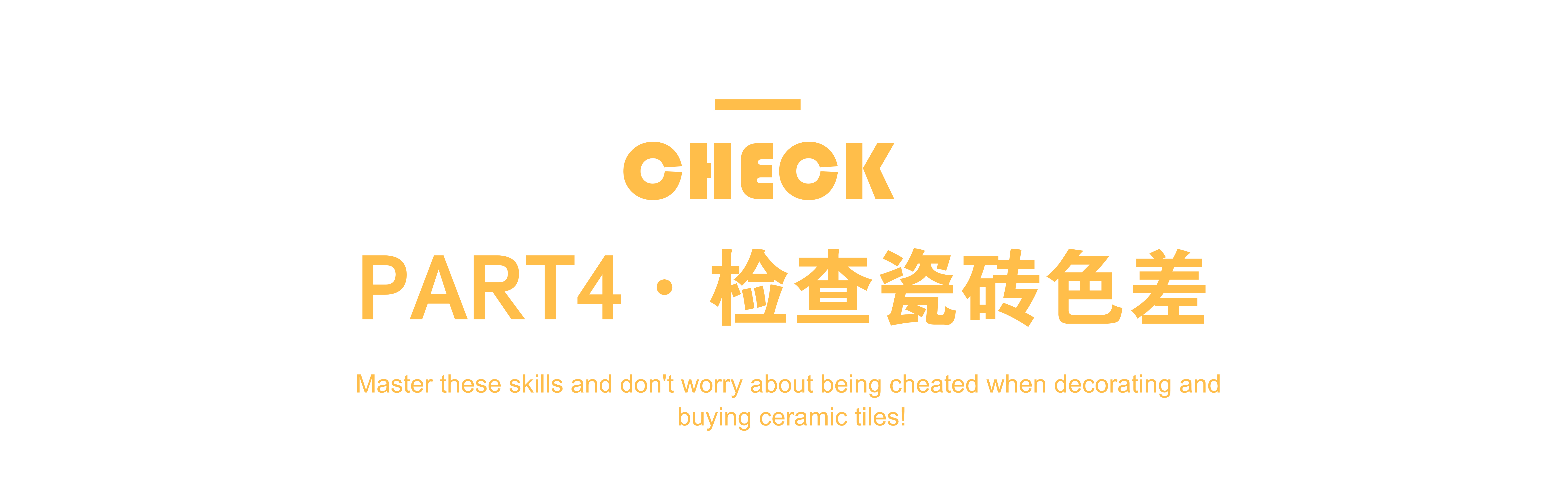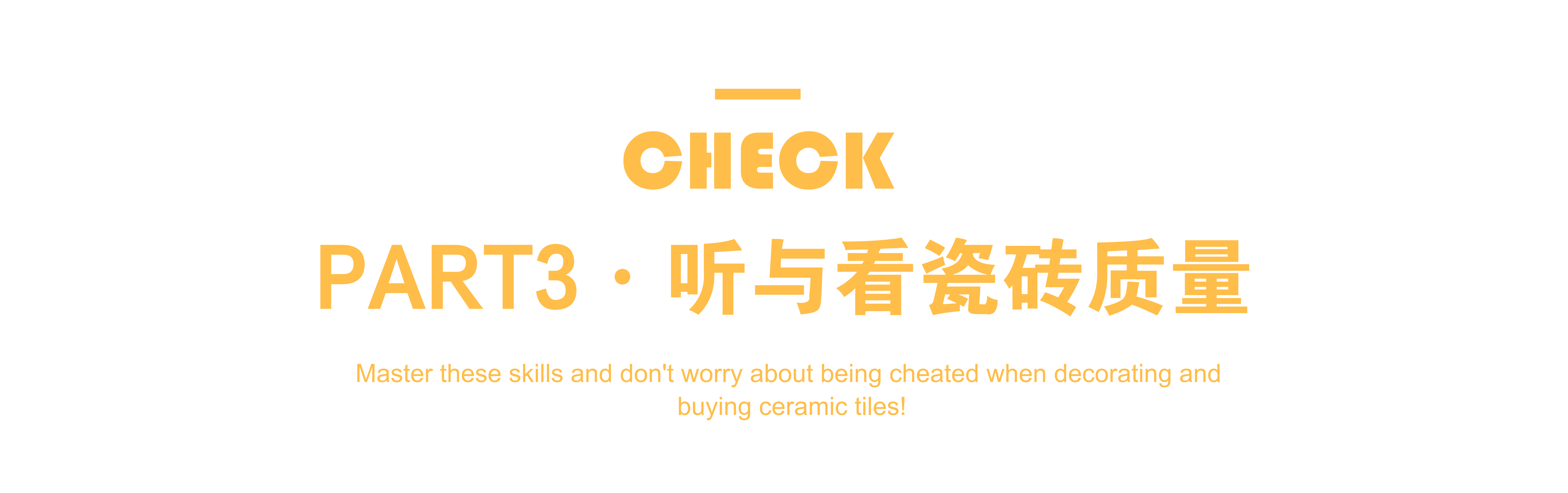 检查时可以用适当力度手握钥匙等较硬的工具刮擦瓷砖表面,如果表面极易出现刮痕,则代表施釉不足。这样的瓷砖表面易受污,难清理,建议谨慎选择。同时,对于瓷砖的质量好与坏,我们参照瓷砖表面的光滑度,如果瓷砖表面发出很自然的光泽,则表示其瑕疵较少。