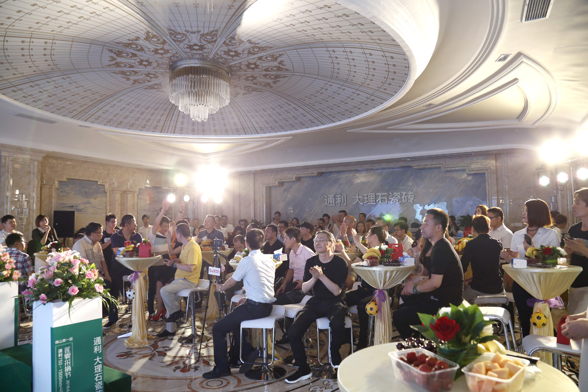 一场视觉、听觉、味觉并重的饕餮盛宴在通利大理石瓷砖总部惊艳呈现!中国建筑卫生陶瓷协会副秘书长尹虹博士,佛山市陶瓷行业协会秘书长罗青,佛山市禅城区南庄镇陶瓷产业促进会工作组副组长于枫,山西室内装饰协会设计委主任武俊文,通利大理石瓷砖董事长兼总经理林柱权,董事副总经理张念超,董事副总经理孔繁湛,市场品牌中心总监张恩铭等领导嘉宾亲临现场。本次盛会吸引了众多媒体到场!不仅如此,山西室内装饰协会设计委主任武俊文老师更是以《浅谈设计与材料应用趋势》为主题,从设计应用的角度,称赞了750x1500mm符合建模指数,自然经典石纹类的花色经典耐看。