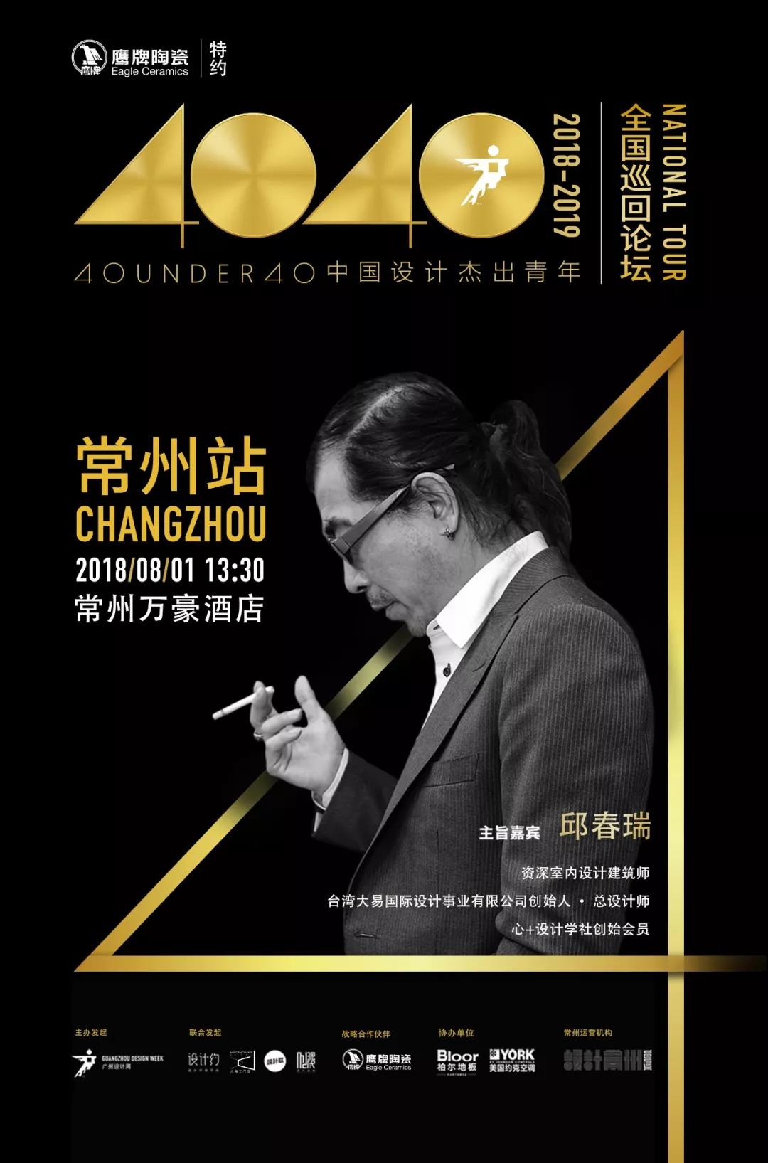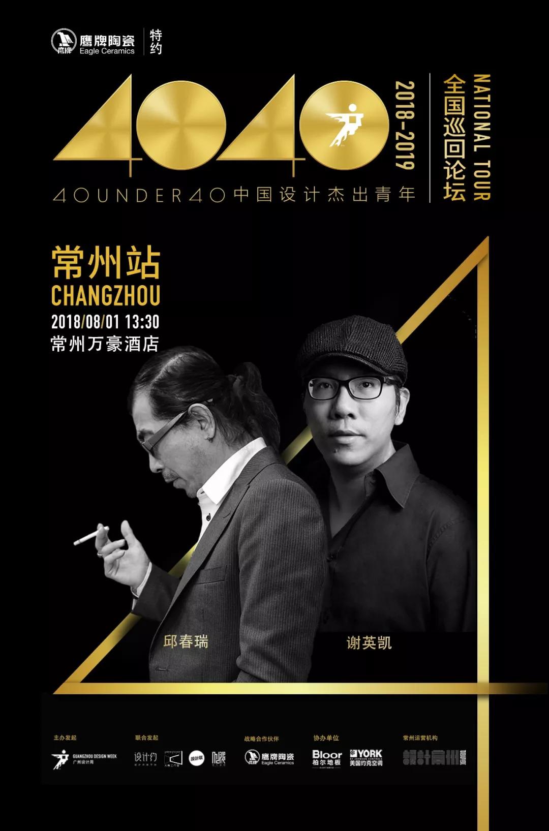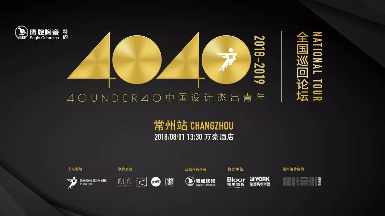40UNDER40中国设计杰出青年(2018--2019)全国巡回论坛 · 常州站,由广州设计周主办发起,设计常州Design作为协办单位,鹰牌陶瓷作为全国战略合作伙伴将全程支持与参与,助力“中国设计黄金一代”,推动中国设计继续前行。