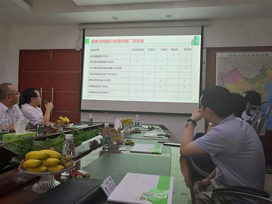 7月19日,为加强陶瓷行业对工业润滑油行业的认识和了解,佛山市陶瓷行业协会秘书长罗青、副秘书长潘勇文、佛山市恒力泰机械有限公司设备部经理韩宇鹏一行受邀前往东莞松山湖科技园参观安美科技股份有限公司中国总部,安美科技股份有限公司董事长汪小龙率领安美公司高层领导及技术人员进行热情地接待,双方就如何改善陶瓷厂设备的工作环境,提高设备使用寿命,如何降低陶瓷厂设备保养的复杂性与额外成本,以及安美公司如何向陶瓷厂提供优质的服务和合适的工业润滑油品解决方案等问题举行了洽谈会。
