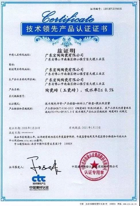 中国建材检验认证集团(CTC)授予玉瓷砖“技术领先产品认证证书”